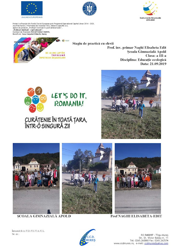 Astăzi, 21 septembrie 2019, ȘCOALA GIMNAZIALĂ APOLD s-a alăturat acestui proiect. La aceastiă acțiune au participat un număr de 7 cadre didactice și elevii claselor: pregătitoare, clasa I , clasa a II a, clasa a III a, clasa a IV a, clasa a V a, clasa a VI a, de la Școala Gimnazială Apold.