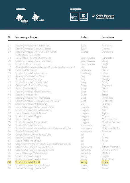 Astăzi am făcut publică lista laureaților pentru proiectul „Dăm Click pe România”, unde vă aflați și dumneavoastră. Găsiți mai jos linkul: https://www.educlick.ro/blog Pe această cale, vă felicităm din nou pentru munca depusă prin care ați devenit laureat al acestui proiect! De asemenea, vă invităm să ne urmăriți pe paginile noastre de social media unde vom publica imaginile pe care le vom primi de la dumneavoastră odată ce calculatoarele sunt instalate și folosite de către copii. În plus, toate oportunitățile și programele de donație vor fi făcute publice pe aceste canale de facebook.